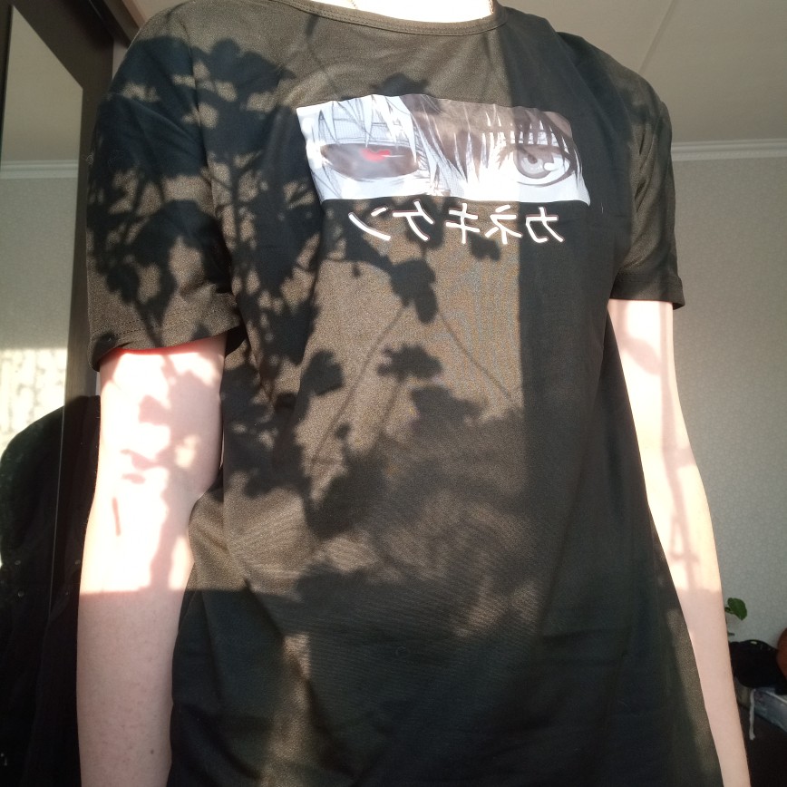 The print is certainly not made of quality. The chip is more blue than black, the material will come out. And in general, it's generally quite normal for its price. I love T-shirts with Kaneki